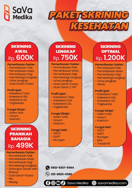 Di era modern ini, gaya hidup yang penuh tekanan dan minimnya perhatian terhadap kesehatan sering kali menjadi penyebab berbagai penyakit kronis. Sayangnya, banyak orang baru menyadari pentingnya kesehatan setelah terlambat. Untuk mencegah hal ini, Sava Medika menghadirkan Paket Skrining Kesehatan yang dirancang untuk membantu Anda mengenali kondisi tubuh secara menyeluruh.